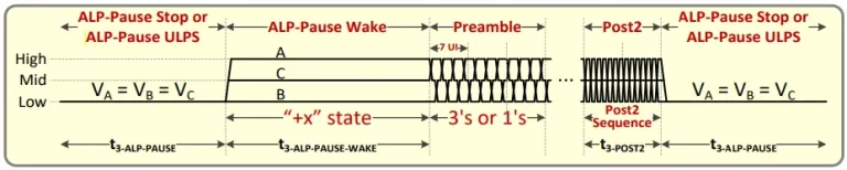 ALP in MIPI C-PHY addresses the same problems previously described for MIPI D-PHY, yet the solution is somewhat different as it takes advantage of MIPI C-PHY reserved words for lane signalling events. The line levels are shown in Figure 9. There is some similarity with MIPI D-PHY, as the concepts of ALP-Pause and ALP Wake pulses are common, but with key differences: ALP Pause only requires VA=VB=VC, translating to a collapse of the differential swing for AB, BC, CA pairs but not necessarily implying grounded levels like in MIPI D-PHY. The Wake state is typically +X, where A line is high and B is low so that VAB = Vod_strong level, with C line at mid-level.