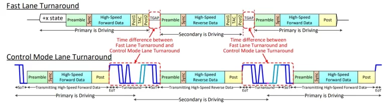 In between, High-Speed data or reserved Symbol sequences representing certain functions are sent to the link partner. One of these reserved sequences is the Turnaround Code (TAC), which initiates a Fast Lane Turnaround procedure where Primary side stops transmitting and moves to a receiving state while Secondary side moves to a complementary state. This procedure has similar benefits to those identified in MIPI D-PHY, specifically reducing latency of the operation compared with legacy LP Control Mode Lane Turnaround, as it is not constrained by the large LP state durations.
