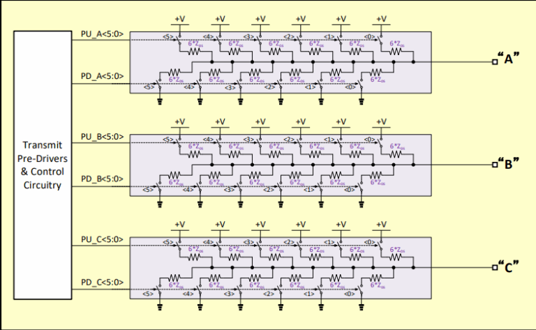 The 18-Wirestate line driver is a natural extension of the 6-Wirestate driver, incorporating six pull-up/down legs individually controlled by the pre-driver circuitry. Each leg has an output impedance six times higher than the nominal differential impedance and can easily generate the ‘high’, ‘low’, and ‘mid’ levels required in 6-Wirestate mode. There is no expectation that Transmitter De-emphasis is used in 18-Wirestate mode.