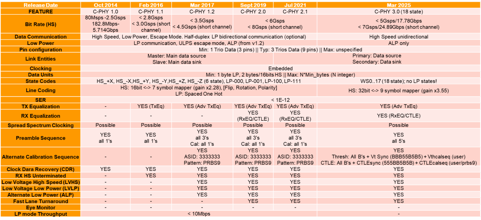 The following table summarizes the main MIPI C-PHY features across specification versions.