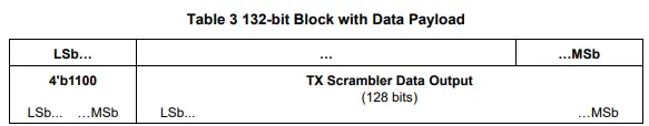 Protocol data is scrambled using the polynomial G(x)=x23 + x21 + x16 + x8 + x6 + x2 + 1 and seed 0x1DBFBC, which is reset upon transmission of the Start of Packet (STP) control code. Any missing data from the protocol, to complete the 128-bit payload, is padded with zero-value bits.