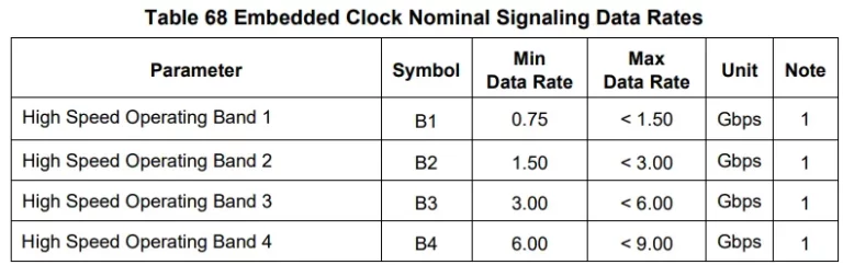 Due to the band-based nature of the interface, a reference-less CDR may be used in every Secondary PHY instance. This unit locks onto the incoming bit stream at a rate within one of the four defined bands. This is important as it does not require the Secondary IC PHY to be pre-programmed to operate at a specific rate, thereby relaxing the requirements on PLL design. More importantly, it obviates the need for a local crystal reference, simplifying the overall design and reducing costs.