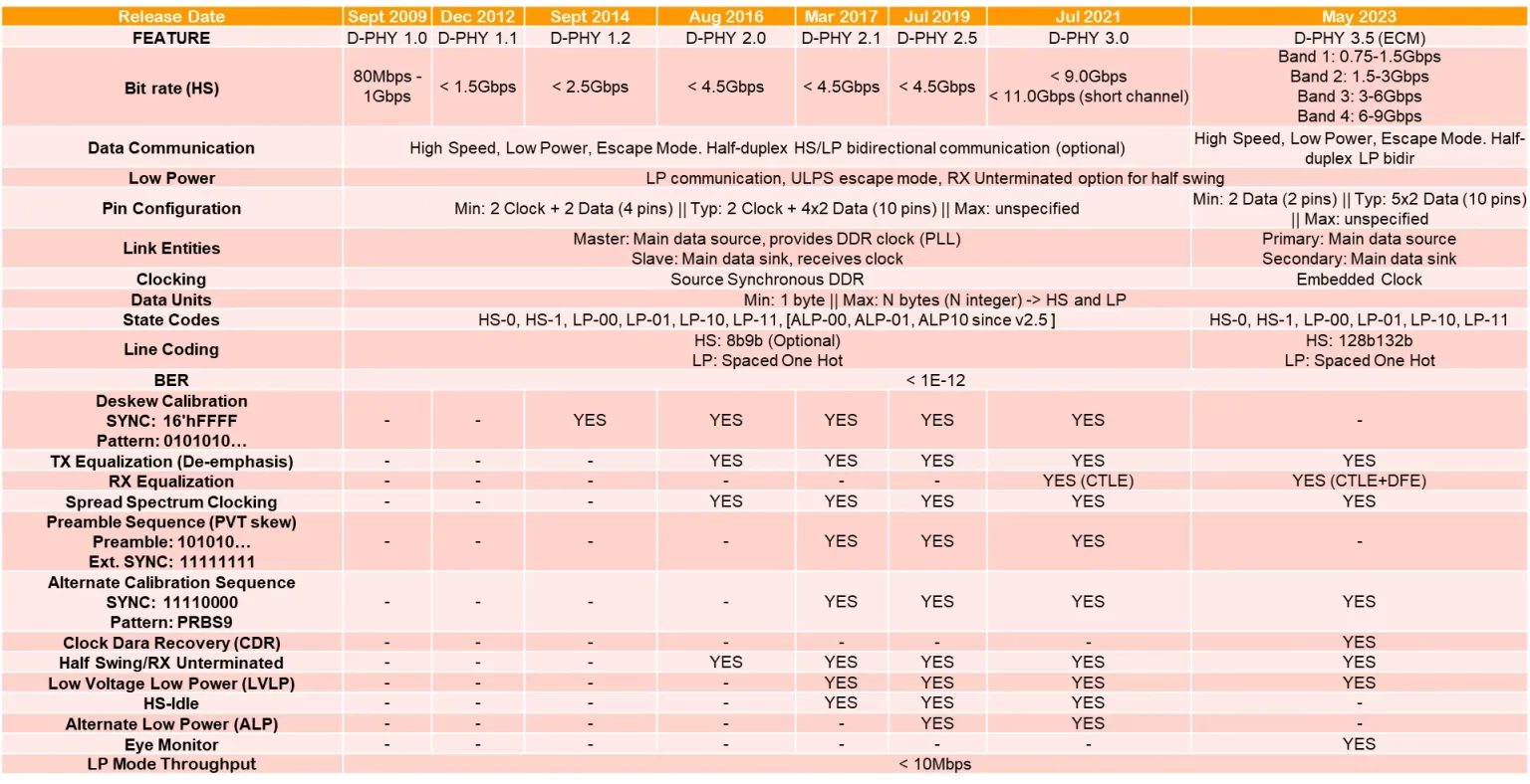 The following table summarizes the main D-PHY features across specification versions.