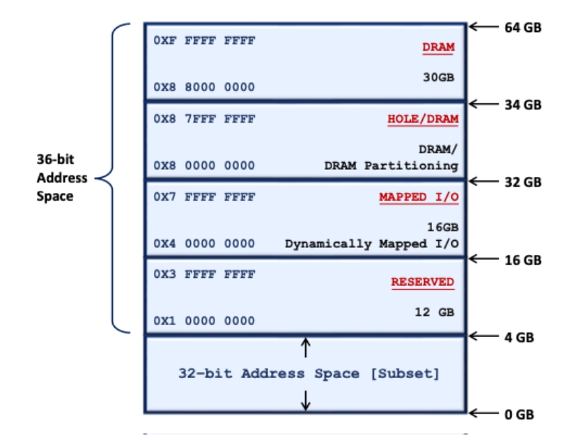 Using 36 bits (address bus), we can design a 64-bit SoC comfortably with all I/O interfaces, controllers, and memories within a 64GB address space. This allows us to expand the DRAM more than 30 to 40 GB and realize any kind of bare-metal complex embedded and OS-based desktop applications.