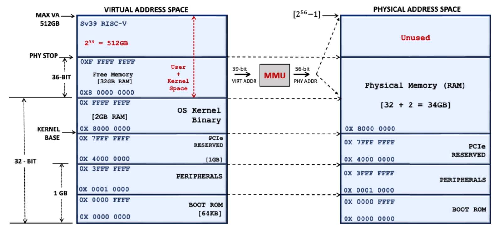 The Sv39 address translation scheme generates a 39-bit virtual address with 512GB of virtual address space for software applications and a 56-bit physical address with 64PB of physical address space, as shown above. The 32-bit memory map is always a subset of the 36/40-bit memory map for backward compatibility—porting 32-bit software (OSes, bootloaders & drivers) to 64-bit systems. Generally, the firmware, bootloaders and test codes are 32-bit software even for 64-bit SoCs. It executes without MMUs; hence all peripherals must be implemented within the physical address space - following physical addressing, as shown in the above figure.