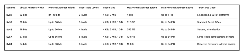 Usually, we prefer a 36/40-bit memory map to design 64-bit RISC-V SoCs, rather than simply using a 64-bit address space (address bus). Also, RISC-V offers various address translation schemes - Sv39, Sv48, Sv57, and Sv64 - to increase the virtual and physical address space for 64-bit SoCs, as shown below.