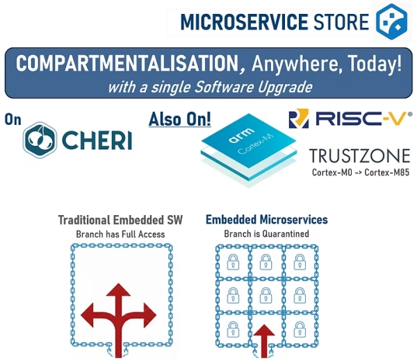 "embedded Microservice Runtime", by Microservice Store, brings compartmentalisation to embedded systems through embedded Microservices, enforced by an integrated Embedded hypervisor inside the embedded Microservice Runtime. The result is practical isolation on real devices, including highly constrained microcontrollers, without requiring a specific new CPU architecture.