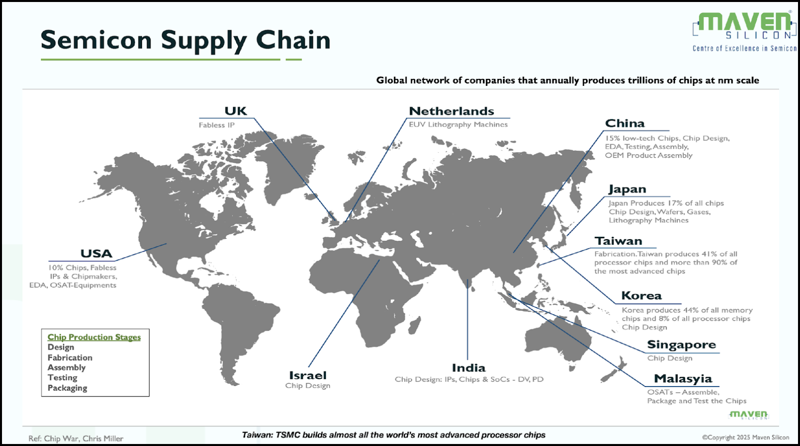 Let’s begin with understanding the global semiconductor supply chain that spans across multiple countries. It will inspire you to learn from this article and explore the semiconductor manufacturing ecosystem.