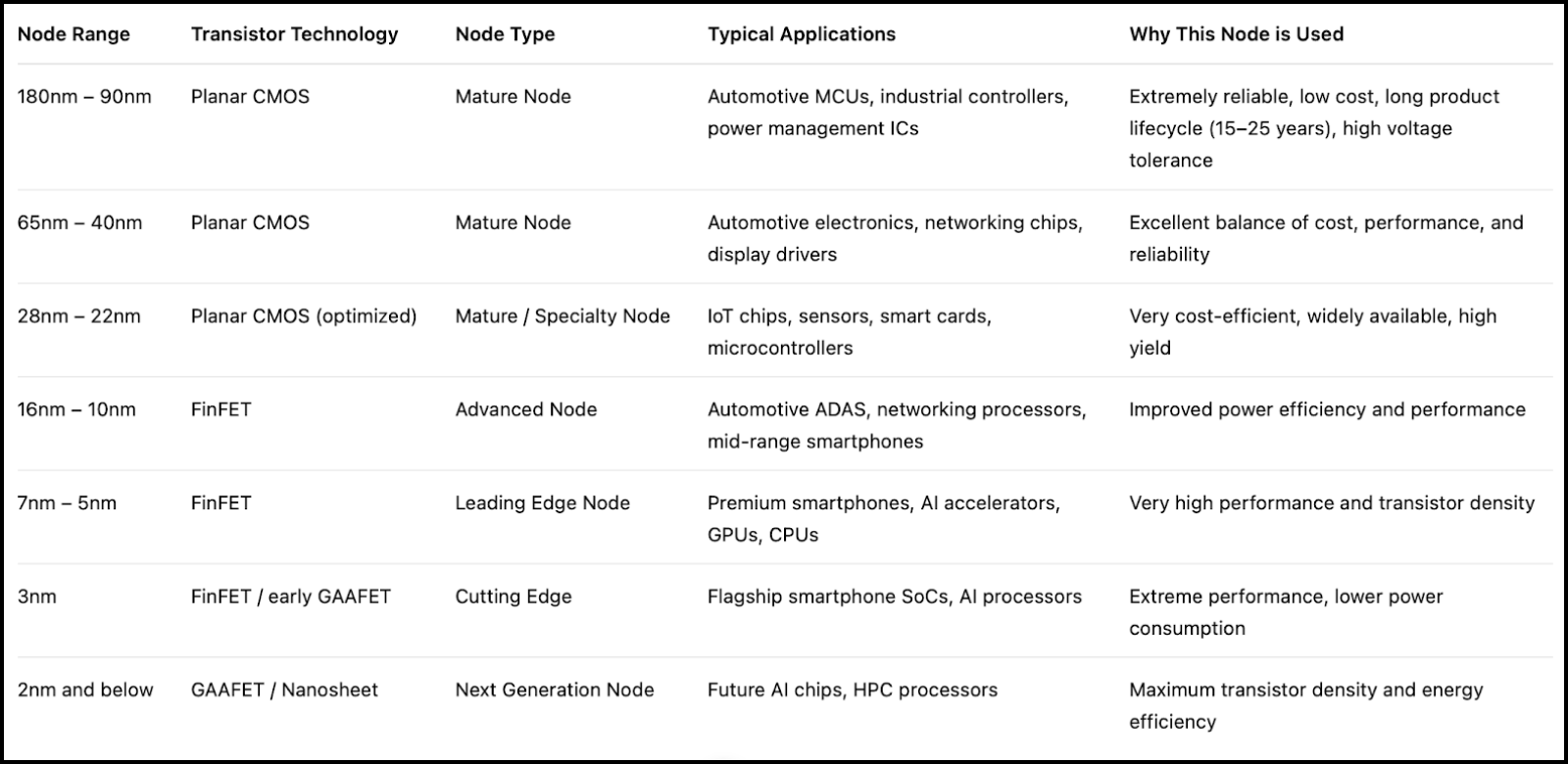 This table explains how different semiconductor nodes serve different industries.