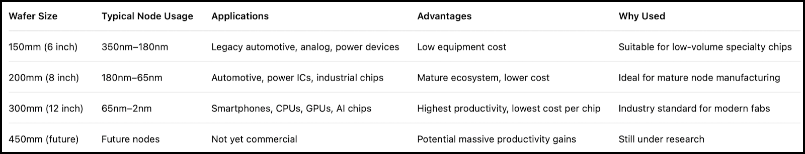 Wafer Comparison Table: Sizes, Applications, Yield, and Manufacturing Economics