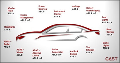 The Functional Safety IP cores CAST provides conform to safety integrity levels from ASIL B to ASIL D and are suitable for a variety of automotive subsystems.