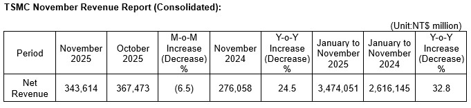 HSINCHU, Taiwan, R.O.C. – TSMC (TWSE: 2330, NYSE: TSM) today announced its net revenue for November 2025: On a consolidated basis, revenue for November 2025 was approximately NT$343.61 billion, a decrease of 6.5 percent from October 2025 and an increase of 24.5 percent from November 2024. Revenue for January through November 2025 totaled NT$3,474.05 billion, an increase of 32.8 percent compared to the same period in 2024.